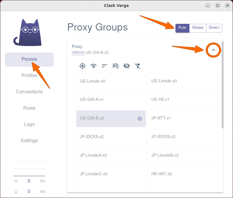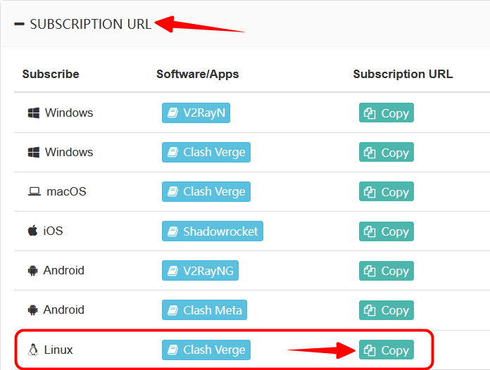 | 在开始之前,建议您将系统版本升级到最新,以避免因为执行环境问题不能启动程序。 本文于 Ubuntu 22.04 环境下编写,Debian 及其派生 Linux 发行版应该也同样适用。 安装 Clash Verge 在客户端推荐下载客户端或 请访问 Clash Verge 官方网站下载最新版程序,下载文件名类似 clash-verge_x.x.x_amd64.deb。 下载后打开下载资料夹,右键点击空白处,在右键选单点击「Open in Terminal」,然后执行下面安装命令(请修改实际文件名)。 sudo apt -y install ./clash-verge_x.x.x_amd64.deb 配置 Clash Verge 在系统 Applications 界面打开 Clash Verge,然后点击程序「Settings」->「Clash Core」,切换使用「Clash Meta」,最后点击「RESTART」。 ![]() 在机场推荐订阅节点,接着登入网站,进入「我的服务」页面,点击已购买的产品服务,找到对应程序的订閲地址,复制备用。 ![]() 点击 Clash Verge 左侧「Profiles」选项,将订閲地址填入「URL」框,点击「IMPORT」,然后选中下载的配置文件。 ![]() 点击 Clash Verge 左侧「Settings」选项,开启「System Proxy」选项,下面两个「开机启动」选项也建议开启。 ![]() 点击 Clash Verge 左侧「Proxies」选项,点击右上角切换代理模式(通常使用「Rule」模式。如果需要全部访问透过代理,则选择「Global」模式)。点击 Proxy 右侧的「箭头图标」可以展开节点列表。 ![]() 至此,您便可以开始使用了。 |
