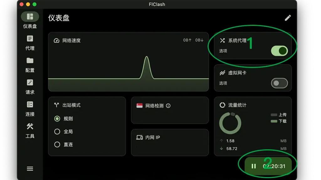 下载时可能会提示“此程序不是常见的下载内容,可能会危害您的计算机”,请点击保存–仍要下载,安装时如果遇到拦截,请点击显示详细信息–仍要运行,然后继续安装。 FlClash 配置使用教程不知道 FlClash 怎么用的朋友不用担心,它的配置非常简单,跟着教程,五分钟包教包会。不过不同系统界面有一丢丢的区别,朋友们可以自行举一反三哈😄。话不多说,请看 VCR 👇 ![]() 第一步:下载 FlClash ,安装并启动第二步:获取订阅地址Clash软件本身都是免费的,但都必须添加海外服务器节点。如果您没有 Clash 节点订阅地址,可点此购买订阅。已经有订阅地址,可直接下一步。 ![]() 第三步:导入节点配置自动导入订阅节点如上图所示,只需点击Clash 图标并确定。稍等几秒即可自动导入配置文件,效果如下图所示: ![]() 手动下载订阅节点遇到自动导入下载配置失败或无响应,您可先点击首页的导入订阅,再点击复制订阅地址,然后如下图所示:粘贴到订阅地址的输入栏,再点击下载按钮。 ![]() 第四步:开系统代理并启动 ![]() 特别注意:除了打开 系统代理 的开关,还需要点击右下角的启动按钮❗ 现在您应该已经可以打开Google 了。如果打不开,建议您仔细核对上述步骤和教程中的示意图是否一致,并查看常见问题解答,99%+情况都能顺利联网,加油! 软件特色它凭借以下特色,成为众多用户的首选,尤其适合追求高效和多设备统一体验的用户: 卓越的跨平台支持FlClash 的核心优势在于其原生支持 Windows、macOS、Android 和 Linux 四大主流操作系统。 统一且优雅的用户界面FlClash 在所有支持的系统上都提供了设计精美且交互逻辑统一的用户界面,无论您使用何种设备组合,都能获得几乎完全一致的使用体验。 便捷的跨端配置同步如果您在多台设备上使用 FlClash,其配置文件同步功能将会非常方便。您可以通过本地文件备份或者借助 WebDAV ,在不同设备之间实现代理配置、规则集的同步,确保设置始终如一。 支持虚拟网卡 (Tun) 模式对于需要代理特殊应用程序或游戏的用户,FlClash 提供了强大的 Tun 模式支持(部分系统可能需要额外配置)。Tun 模式能创建一个虚拟网络接口,接管设备上几乎所有的网络流量,从而实现比普通系统代理更彻底、更稳定的全局代理效果。 ![]() FlClash 常见问题Flclash 还在更新吗?